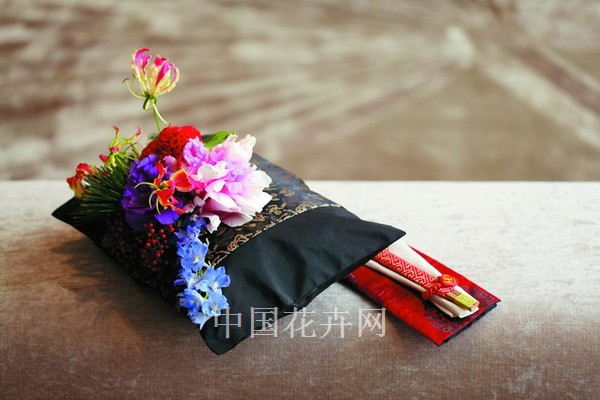 設計理念:作品以生活中的抱枕作為花器。中國年正值隆冬,而抱枕給人安全、舒適、溫暖的感覺,與花結合的設計又給人一種時尚感。