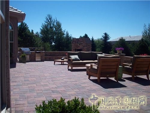 庭院位于美國科羅拉多州科泉市的高檔住宅,采用柔和的45度圓角曲線,設計彎曲環繞的半墻和通向壁爐的彎曲臺階,顯示出隨意典雅的自然風格。是作為娛樂消遣的場所,滿足進行多種活動,形成比較溫和的團聚氣氛。