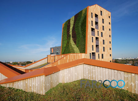 住宅樓的主立面用三種類似色調(diào)的陶土覆面,色彩由輕至重,似乎是在折疊立面。第六層的屋頂和墻面如同一系列折疊的綠色空間,種植了當(dāng)?shù)氐幕ú?,為居民提供了休閑空間。攀爬植物在墻面上攀援而上,成為歐洲最高的綠植墻。