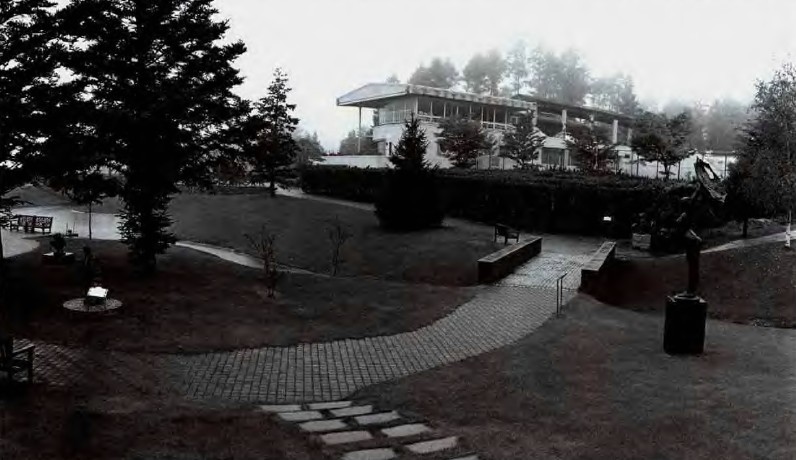 穿過亭子看雕塑和水池