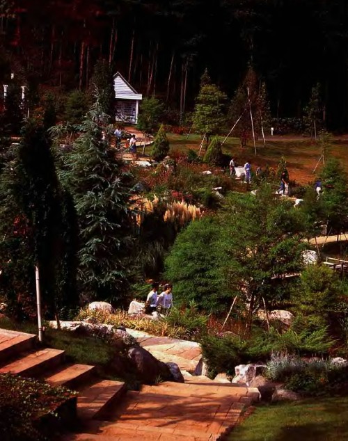 山谷部設置配備修景池的日本庭園,周邊種椊了菖蒲、百合、杜鵑等椊物生長群、吸引著上同季節的來園可。手工工藝區上僅為手工藝者提供了生產制作場所,也為游人提供了參與手工制作的場所。最后登上臺階回到入口。