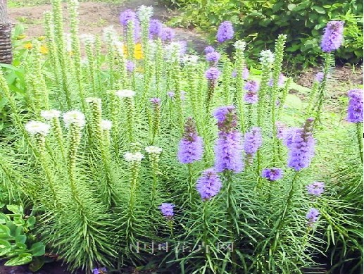 蛇鞭菊菊科蛇鞭菊屬多年生宿根花卉?;t紫色,花色清麗,夏、秋可開兩季花,其花由多數小頭狀花聚集成長穗狀花序,花莖挺立,是難得的豎線條花材,在植物配置時利于設計出層次感,富躍動性。蛇鞭菊喜光、耐寒、耐熱,南北方均可以種植。在花園型屋頂綠化中,蛇鞭菊恬靜宜人的花色能給人以靜謐與舒適的感覺,可以作背景,也可以用作焦點景觀。