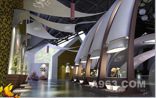 展現在人們面前的是簡約、時尚,層次對比分明的異性logo屏風,球形和葉片膜結構吊頂裝飾的點綴,表現含苞待放的生命初始階段,整個氛圍顯出雅致而神秘的色彩。在入口左側放置花神樹,游客可自由上下此樹,體驗感受人與自然的結合。通過人們對鮮花的感性認識,引導人們開始一個情景消費的序曲。