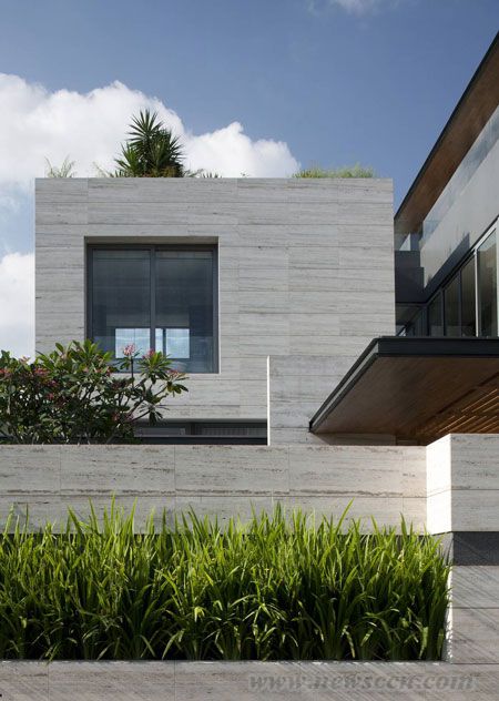 西側厚重的石灰石墻和大塊的垂檐減少了下午陽光的直射。入口處、起居空間和臥室縱向排列,有助于自然交叉通風和光照的進入。為了盡可能利用土地,四層樓的房屋有一層是位于地下的。花園和水景遍布于房屋四處,底層的起居間和餐廳則面朝泳池和一座魚塘。
