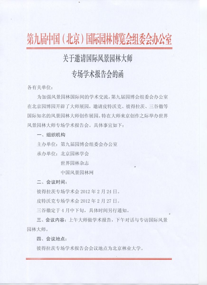 為加強風景園林國際間的學術交流,第九屆園博會組委會辦公室在北京園博園開辟了大師展園,邀請皮特沃克、彼得拉茨、三谷徹等國際知名的風景園林大師創作展園。特在大師來京創作之際舉辦世界風景園林大師專場學術報告會。具體事宜如下: