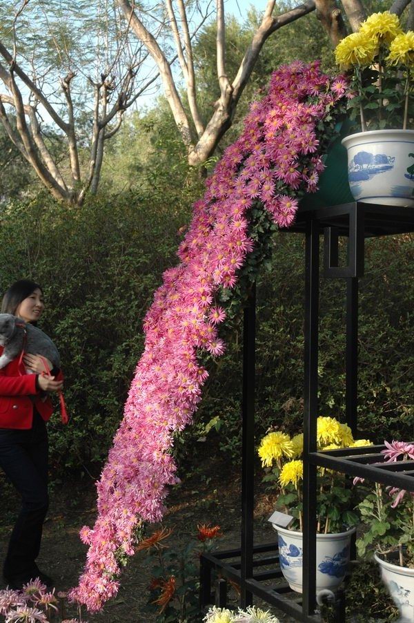 造型菊變成了“攀緣植物”,和紅墻相映成輝