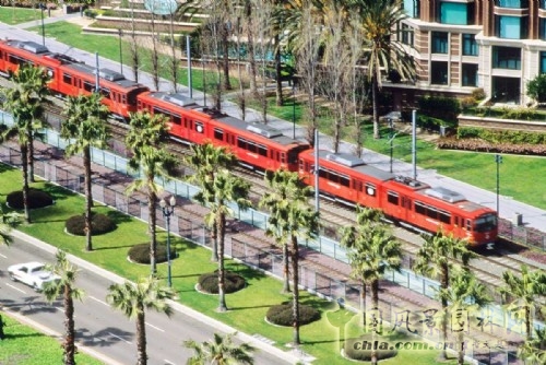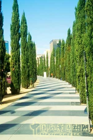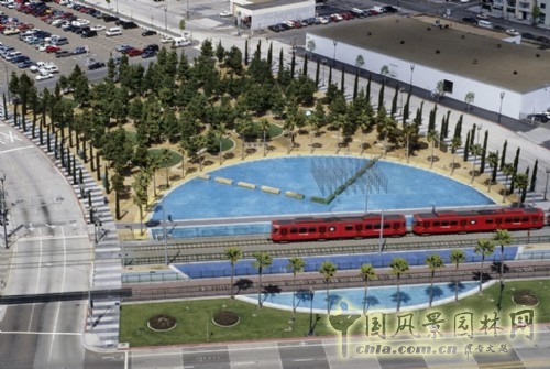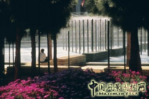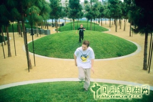 中國風(fēng)景園林網(wǎng)訊 1983年,美國當(dāng)代景觀大師皮特·沃克組建成“PWP景觀設(shè)計公司”。馬丁路德金景觀大道是一塊10英畝的線型景觀,由PWP景觀設(shè)計公司1987年設(shè)計完成,位于加利福尼亞西部城鎮(zhèn)內(nèi)河碼頭邊。項目通過一系列平行的條紋垂直地與圣塔菲鐵路的軌道對接,并且環(huán)繞旁邊的城市交通道。1995年P(guān)WP景觀設(shè)計公司又對這塊景觀的中心做了裝飾性設(shè)計,大圓形水池柔和了內(nèi)河碼頭和城市的網(wǎng)格狀結(jié)構(gòu)。