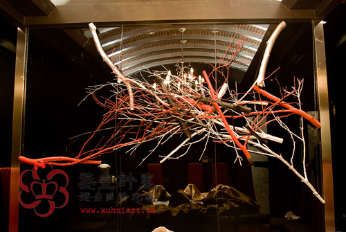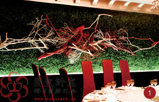 1、草皮成大片壁飾是大創意,柚柑枝漆成紅色、銀色,與大空間穿插,配合成抽象花藝設計。花材:柚柑枝、草皮。
