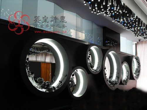 2、6個大小圓鏡,因圈內環燈反射,用色是高難度。以鋁條架構曲線,黑色圓片加銀色玉蘭花,表現酷勁、個性。大圓鏡內的色彩映入,因此用色與設計一不小心就會顯現亂相,是最為困難的表達。