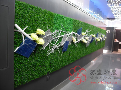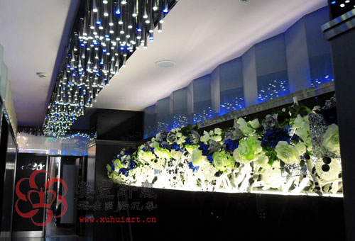 4、整體表現長廊的深遠與藝術感,以大片綠草皮襯底,加銀、藍鋁片與銀枝杈,與頂上燈飾呼應色彩。