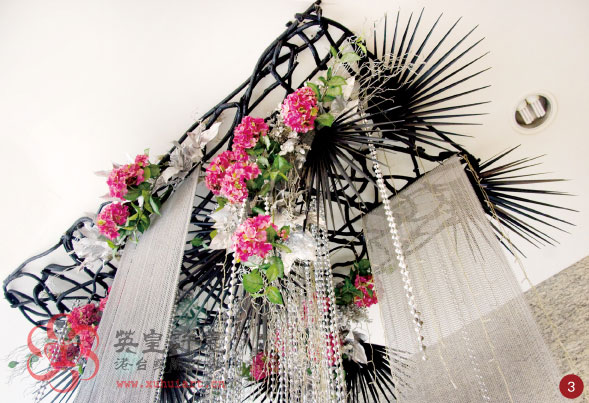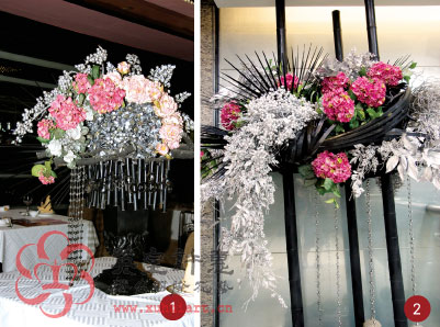 2、以黑色粗竹管做支撐,大把的黑色竹片,強而有力的扭轉架構,配上下垂的大量銀果實,大氣又后不是浪漫的演繹,有絕對性的視覺震撼效果。