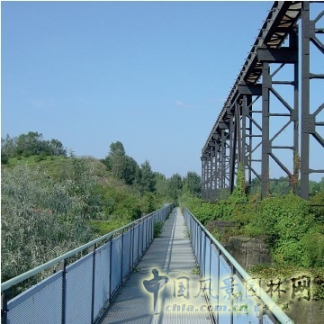 圖中曾經是“工業大國”德國的一個鋼鐵廠,但已被完全毀壞,變成一塊廢墟地,也成為了一種“不良場所”,彼得·拉茨(Peter Latz)對其進行了設計改造,現在這里是一片郁郁蔥蔥的景觀,草長鶯飛。300米長的纜橋和高爐車間都保留下來,融合到整個場景中。纜橋橫穿燒結廠,是俯瞰整個景區不同角度和高度起伏的很好場所。
