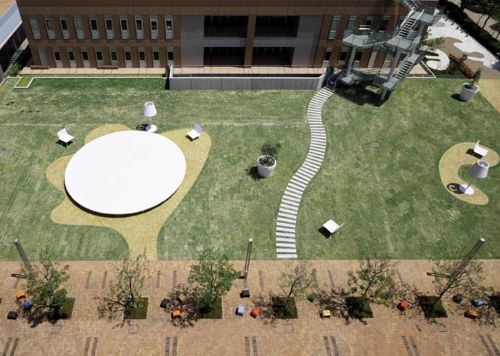 這是日本福岡市一個醫(yī)院及其配套學校的景觀設(shè)計。周邊被電視臺,圖書館,博物館,高層公寓,小學環(huán)繞。景觀設(shè)計師認為這個設(shè)計最重要的是“被認知的概念”,“服務設(shè)施”,“空白”。設(shè)計師也在此指導下進行了設(shè)計。