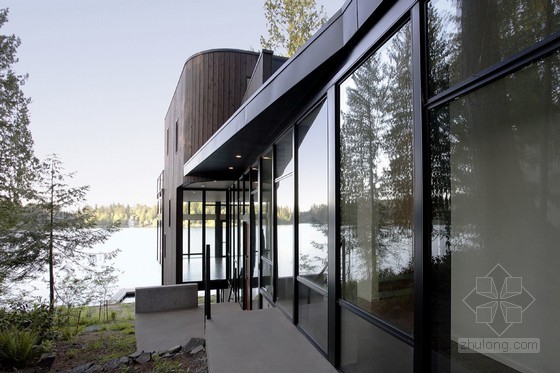 設計方案是創造一個通向水邊的道路,然后沿著道路布置住宅。道路開始于一個帶有附屬車庫和辦公室的汽車停車空間,然后它向下經過臥室區,沿邊的冷杉一直延續到斜坡中部,這里有一個玻璃入口,它將室內室外融合。從這里開始起居空間向著室外景色打開,形成懸臂結構,它的玻璃立面最大限度地爭取湖面景色和自然光的吸收。這些與湖相關的部分都是由木板覆蓋的墻壁包圍,它為住戶提供隱私和美好的視野。從入口往下,住宅漸漸過渡到道路上,這里有一個帶頂的門廊,繼而是一個結實封閉的庭院,最后才是慢慢接近的湖水濕地。