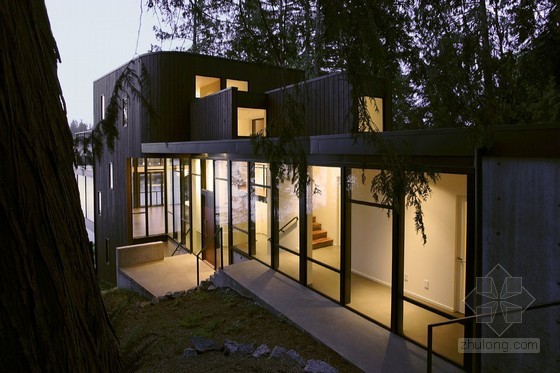 這是一塊小巧狹窄的場地,它順著陡峭的斜坡延伸,一直到美麗的山中溪水。巨大的冷杉樹占據西側場地,東半部分是一個之前被大火燒毀的木屋。設計師的挑戰是為一對年輕有創意的夫婦在這里設計一個住宅,它即要保護樹木和周圍的自然景觀同時還要延伸住宅的視野,拉近住宅和湖面的關系。