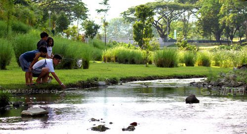 在碧山公園中,一條長達2.7km的筆直混凝土排水渠被恢復成為一條長3km的蜿蜒、自然式的河流,并流經整個公園區域。62hm2的公園空間被重新精心設計,以容納包括浮動的水位線在內的河流系統動態過程,為公園的使用者提供了最大程度的便利。利用回收的水泥渠墻體建造了三個游樂場、餐館,以及一個新的觀景點,大量的開放綠色空間與生態修復后的河流的壯麗景色在城市中心處相得益彰。這是一處值得人們脫去鞋子,與水和大自然接近的地方!