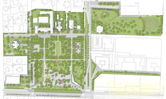 公共廣場變得越來越城市化。公園中的綠樹創造出了一片公共空間。這里作為新園和舊園的轉換連接空間。中心的敞開廣場中鋪設步道,現在標有主要的交通線,可以分流人群。盡管有交通道,但它還是一個綠化公園,有水景,座椅,花園,咖啡館。廣場成為一個居民可以停留的地方,也能夠成為公共中心。