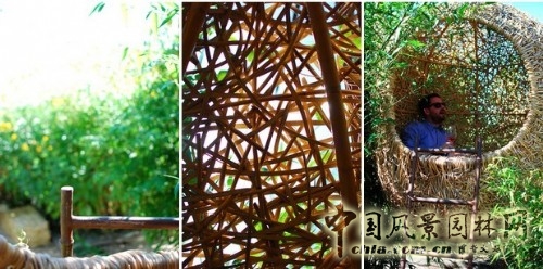 走過球場進入到花園式的迷宮里,又看到幾個編織成繭一樣的巢。南非設計師以那些織雀的大空間筑巢為靈感設計,人可以爬進里面,享受到對周圍高處花朵的清晰觀察的鳥類視覺景象。