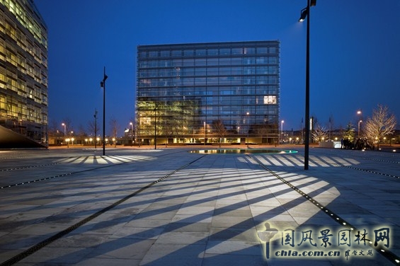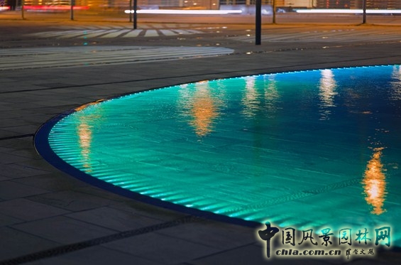 晚上,略帶顫抖的弱二極管光照射水池,散出由寶石綠向綠色變換的色彩,而路燈的條紋暖色光營造出一種獨特而安全的城市空間。
