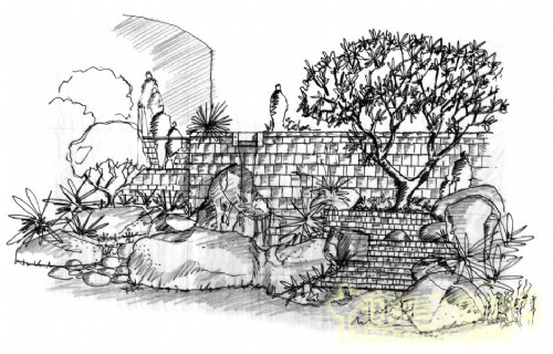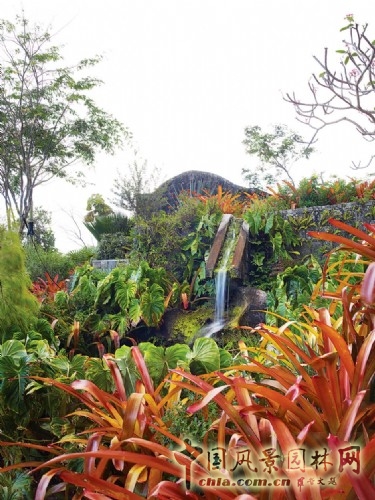 蓄水池:水從雕刻的卵石傾流而下,流入到巖石洞穴,多彩的植物環繞在周圍