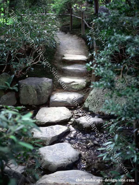 穿越一條小溪與公園池塘,我們無需再花費大量的人力與物力修建裝飾性橋道。如果溪水很淺,如圖中所示的臺階狀石路不失為一個有趣、實用的解決辦法。