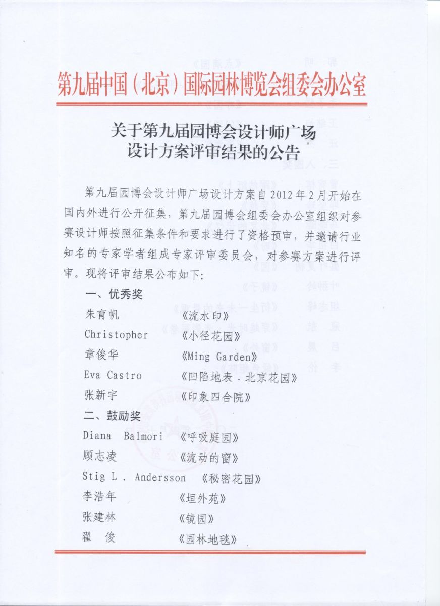 住房和城鄉建設部對為歷屆園博會做出突出貢獻的省、市以及為本屆園博會做出貢獻的單位及個人做出表彰,評出第九屆中國(北京)國際園林博覽會特別貢獻獎、特別成就獎、突出貢獻獎,第九屆中國(北京)國際園林博覽會組織獎 【詳細】
