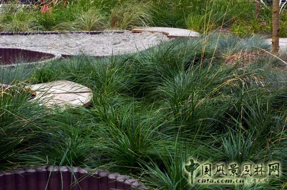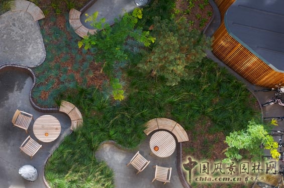 中間的一塊低平地,種植了常綠植物和季節(jié)性觀花植物,確保全年持續(xù)的色彩變幻。為冬季增添暖色調(diào),夏季增添涼意。這里不只是活動(dòng)交流的場(chǎng)所,而且從窗戶看去,是一塊富于變化的漂亮生動(dòng)景觀。
