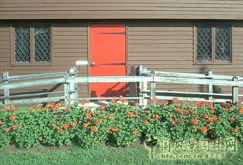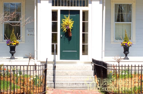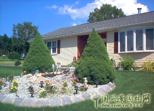 植物的種植并非必須避開正門。圖中所示的景觀坐落于草坪上,離正門入口僅有幾英尺。但是,觀察大道上各種景觀后發(fā)現(xiàn),兩棵矮云杉的美化使入口顯得更加美麗。
