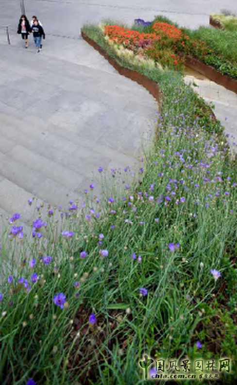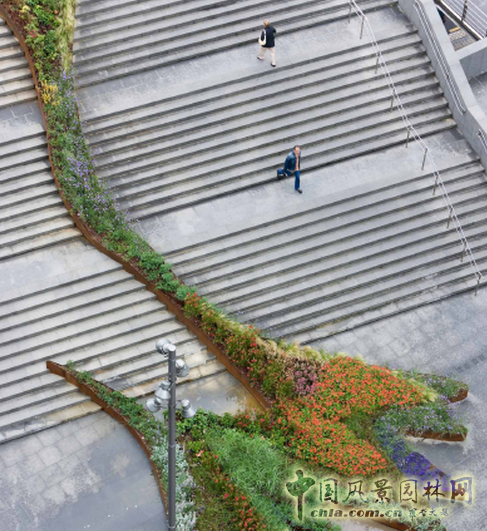 西班牙畢爾巴鄂公園沿臺階而上,外圍輪廓起伏,質地與色彩各異。作為城市的動態(tài)空間,其隨時間和季節(jié)變換。蒼翠的植物如瀑布狀傾斜而下,仿佛花園是浮動的、交融的,各種色彩融為一體。