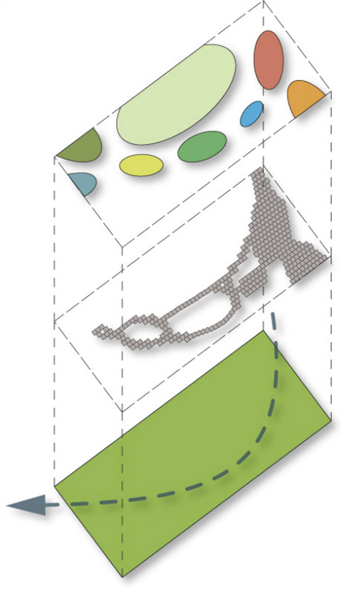 在這里設計師采用了橢圓形的小島形狀。每個島都有適應不同環境的功能,每個島都其獨特的狀態與色彩,多個小島聚集起來,便成群島。在此地,年輕人仿佛進入一種夢境,徜徉漫步,休閑放松,年紀大些的人可以在這里下棋娛樂。休閑場地上有各式各樣的附屬設施,如桌椅和小屋,都是用混凝土磚做成的。這些設施賦予這篇場地一種生機勃勃、堅不可摧的感覺?;炷列∥莸奈蓓斒怯射摪鍢恫馁|制作的。