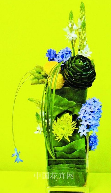 這款以春天為主題的花藝作品是臺(tái)灣花藝師陳垂訓(xùn)的教學(xué)示范作品。其主體造型是以蘇葉包裹花泥制作而成,中空的設(shè)計(jì)獨(dú)具特色,一朵菊花巧妙嵌入其中,紫色風(fēng)信子、熊草、麥穗等常見(jiàn)花材淡雅、高貴,帶來(lái)了春的氣息。作品上部那朵“綠色玫瑰”是該作品的最大亮點(diǎn),花藝師將一片片茶花葉粘貼成玫瑰形狀,精巧而別致。