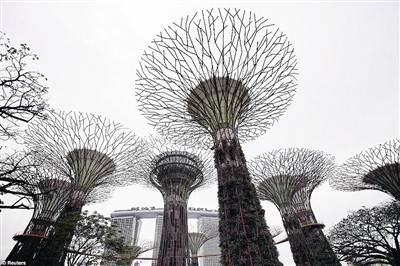 據英國《每日郵報》報道,新加坡海邊的一片“人造森林”1日正式亮相,直聳入云的巨大“樹木”間和盤旋其中的空中走廊令人稱奇。這片“人造森林”被稱為濱海灣花園,坐落于不斷開發中的濱海灣中部,可以稱得上是新加坡最大的花園。