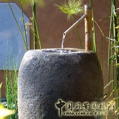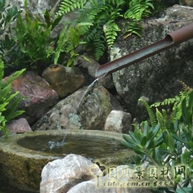 日式花園里的水景通常設計簡易,且較集中于表現水體。這個簡易的水景由一個淺石材水池和鐵質水管組成。水池安置在巖石堆中,再在周圍栽植蕨類等常綠植物。