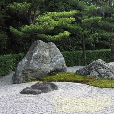并不是所有的日式花園都有真實流動的水體,很多時候也可以用石子、砂礫或沙子代表水體。平坦的小石子緊致鋪設,象征流水。砂礫或沙子傾斜地排列,代表海水起伏的波浪。