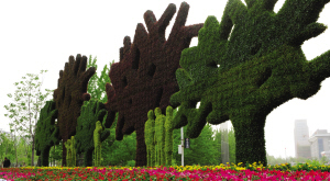 這四組雕塑分別為綠色和平(黃河二路渤海二十四路),吉祥如意(黃河五路渤海十八路路南),和諧共生(黃河五路渤海十八路路北),放飛希望成就夢想(中海大廈門前)。主要由垂釣牽牛、五色草、景天、一串紅、矮天鳥、萬壽菊等多種植物擺設而成。