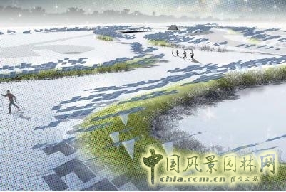 波浪狀的草地收集水分玻璃鏡面散鋪在下面,進一步反射光線,增加太陽能源。冰雪狀的雕塑嵌插在結(jié)構(gòu)系統(tǒng)中,形成太陽與冰雪的共同整體景觀。