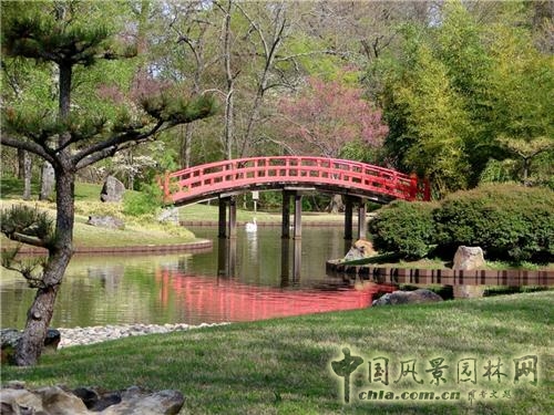 中國風景園林網訊 面積較大的日式花園里通常還有兩個建筑小品:橋和亭臺。
