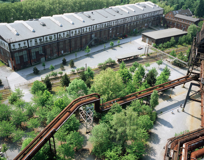道路系統中最有特色的是高達12m的高架鐵路的運用,這是大地藝術作品的展示。該層次不僅形成了獨特的景觀視野,而且作為水平線元素將各個龐大的獨立工業設施聯結起來,豐富了景觀向度公園道路系統--包括公園步行道和自行車路將原來零散分布的城市街道聯結整合成完整的交通系統。