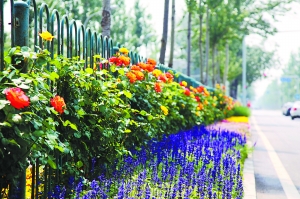 暮春初夏,滿城月季。在北京中關村北大街、遠大路等城市繁華路段,今年的月季更勝往昔。海淀區啟動“百萬月季上大街”工程,在21條重點路段補植了100多萬株新品種月季。婀娜多姿的月季花構筑成一道道“植物生態墻”。
