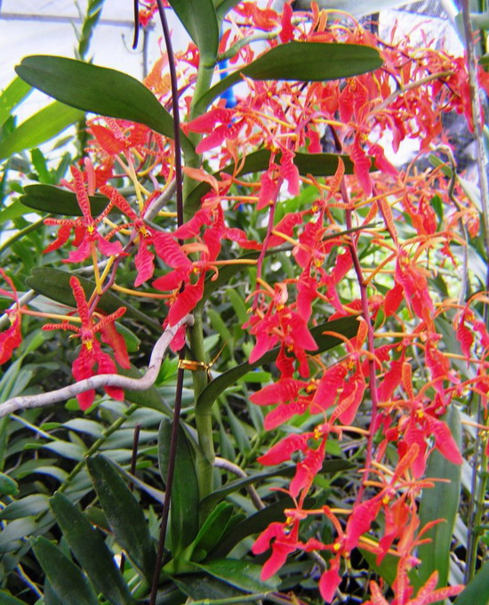 “昆侖火焰蘭”株型直立帶攀援性,葉帶形、綠色、質硬;3年生植株的平均株高60cm,花葶平均長45cm、直徑0.38cm,平均分枝數1.5個,主枝平均花朵數18朵,總花朵數平均26朵,花朵橫徑平均5.0cm、縱徑平均6.0cm。花色鮮紅,帶黃色條斑。在珠三角地區設施栽培時自然花期為4月,花期2-3個月,耐熱性和抗病性較強。昆侖火焰蘭屬火焰蘭中大株型系列品種,與對照品種麒麟火焰蘭(圖3)相比,植株高大,長勢更強,花色深紅。