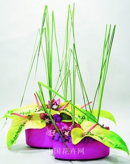 先將大花蕙蘭和綠掌平貼于粉紅色的容器表面,然后將剛草不規則折疊后豎直插入其間。