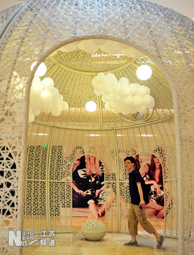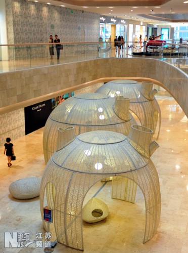 以“明天的花園”為主題的一組大型藤類編制環保裝置藝術品13日亮相南京德基廣場。這組藤編藝術品每個高約1至4米,由藤類材質編制而成,將高端藝術與環保追求相結合,倡導回歸自然的健康理念。