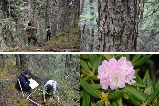 考察隊(duì)在沿途中調(diào)查了白馬雪山目前的森林現(xiàn)狀,并確定在埡口方向設(shè)立永久性小樣地。樣點(diǎn)為海拔4100-4200m的長(zhǎng)苞冷杉、杜鵑林群落,包括3個(gè)20m*50m的樣方、喬木樣方(10m*10m)、灌木樣方(2m*2m)和草本(1m*1m)樣方各共計(jì)30個(gè)。此外,從當(dāng)?shù)匾N遷移了杜鵑屬植物、報(bào)春屬等植物,共計(jì)15個(gè)種450個(gè)個(gè)體。