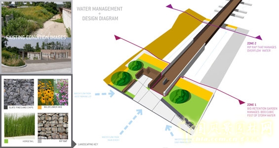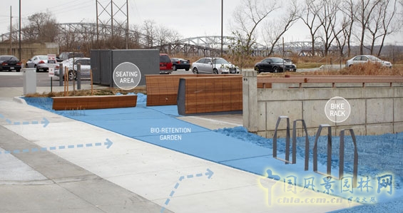 中國風景園林網訊 美國密蘇里州堪薩斯現有的步行橋近日經過改善提升了居民的體驗質量。這項工程要做一個雨水花園,有效解決匯水區問題,考慮設置座椅、行人安全欄、標志牌和自行車u型停靠架的。這個工程的巨大挑戰為設計團隊KEM STUDIO提供了機會。