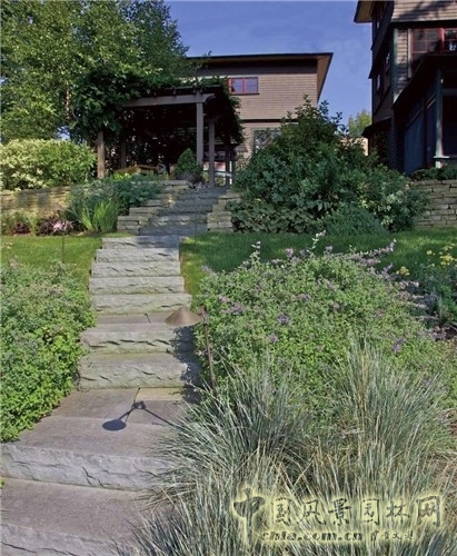 彎曲延伸的臺階邊緣栽植假荊芥藍色燕麥草,營造一種更豐富的動態感覺