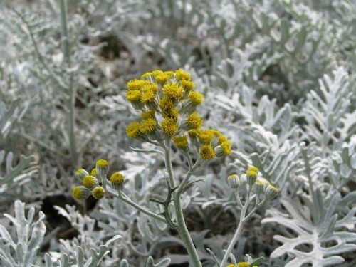 近日在遠處向北京植物園熱帶展覽溫室門前望去,仿佛能看到一片片“皚皚白雪”中綻放出了點點金色的“繁星”!其實,這是銀葉菊正在開花。其銀白色的葉片遠看像一片白雪,與其他色彩的純色花卉配置栽植,效果極佳,是重要的花壇觀葉植物。為此它還有個別名叫“雪葉菊”!