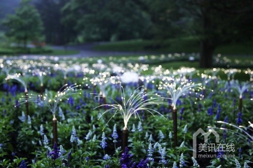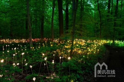 在湖面上Munro運(yùn)用了閃光的CD漂浮在水面,仿佛在給睡蓮致意。在岸邊,7000森林的燈盞展現(xiàn)了它迷人的誘惑。
