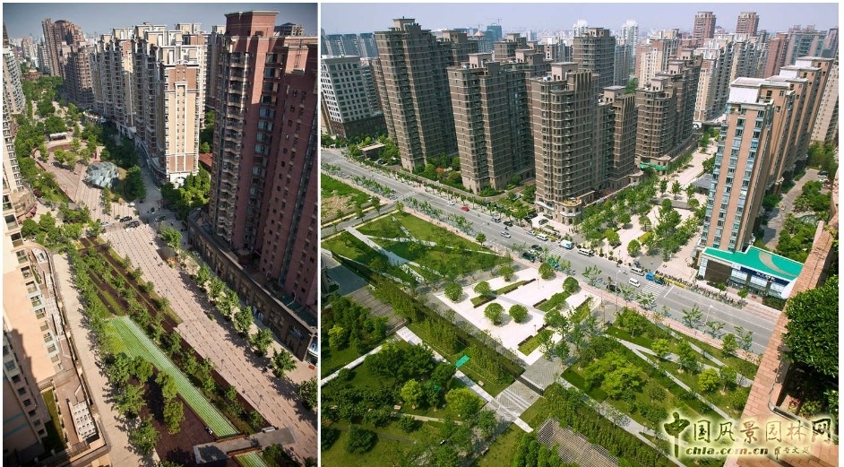 中國風景園林網訊:SWA事務所受上海古北(集團)有限公司委托為繁華的上海構思設計一個獨特的步行街(古北黃金城道步行街)。這個步行街覆蓋了三個城市街區(qū),兩側是20層的住宅大廈,在路邊是零售商店,步行街的兩端是SWA事務所設計的公園。