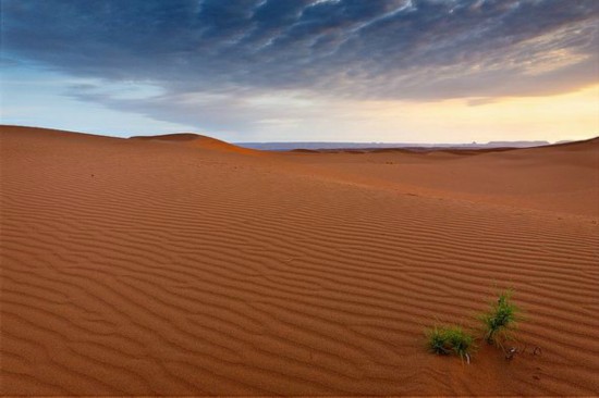 摩洛哥沙漠中的一株植物,在無邊無際的沙漠上顯得非常孤獨,它的綠色也與毫無生息的沙漠橙黃色形成鮮明顏色對比。