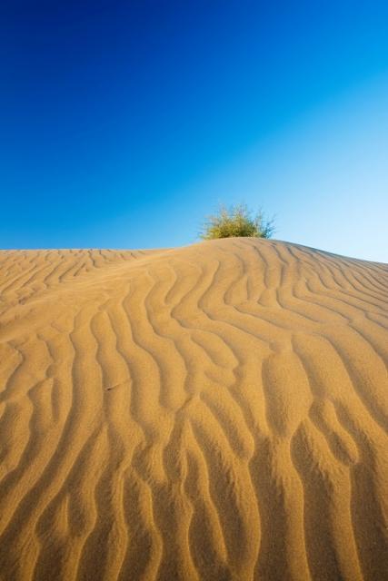 蔚藍色的天空,一望無際的沙漠,這種景象固然很美,但如果沒有這株頑強的小灌木,如此美景也因缺少生命的氣息而顯得黯然失色。